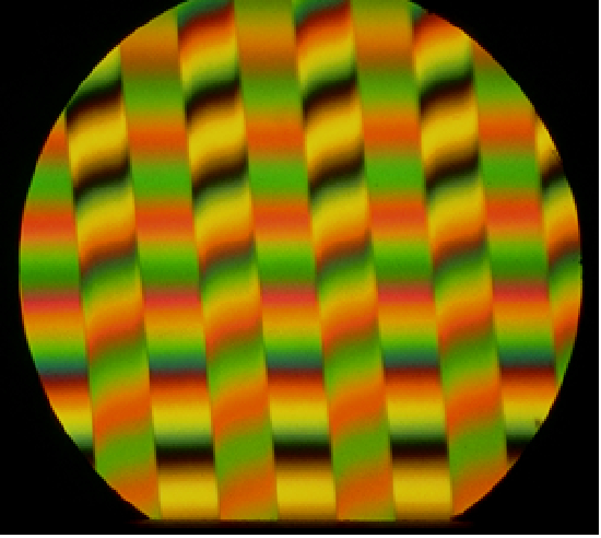 The top image shows white light fringes of a photolithographically-produced grating on a silicon wafer. The trenches are several fringes deep making this a very challenging problem. At Wyko we developed multiple-wavelength interferometric microscopy to measure these gratings based upon the research I did for my PhD dissertation.